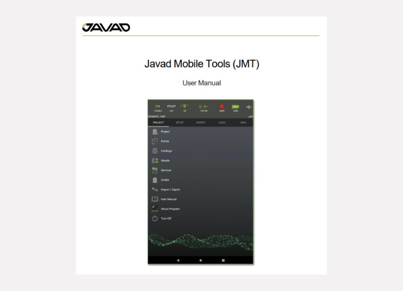 Javad Mobile Tools (JMT) turns your Android phone or tablet into a complete GNSS controller. Easily manage RTK, static surveys, and post-processing tasks. With Bluetooth, Wi-Fi, and network connectivity, you can quickly set up and control Javad GNSS receivers from anywhere.